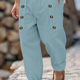 [Trusted] Men's Casual Cotton Linen Pants with Multi-Button Detail - Loose Fit, Solid Color, Perfect for Beach & Summer